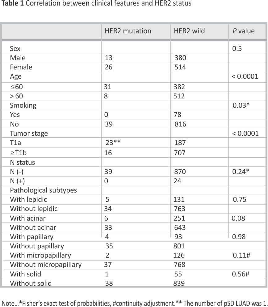 This study indicated that the incidence of HER2 mutation was higher in younger and never-smoking LUAD patients. Furthermore, the growth of LUAD with HER2 mutation was slower than that of those with HER2 wild type. Moreover, most LUAD with HER2 mutation changed into pSD after > 1 cm.