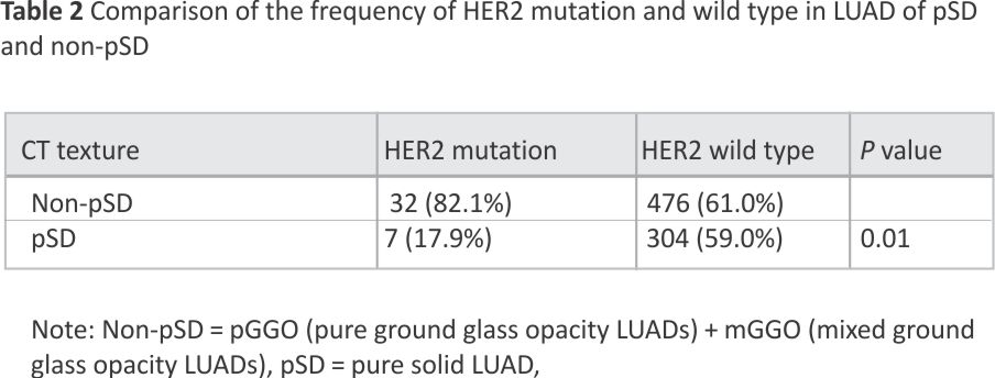 This study has certain limitations. First, the study sample was small; therefore, l, the details of HER mutation tumor stratification could not be analyzed. Second, the analysis was limited to adenocarcinoma, and other histologic subtypes were not addressed. However, the majority of HER2 mutations are found in adenocarcinoma. Third, no survival data were collected in this study; therefore, the relationship between tumors of different textures and survival was not assessed.