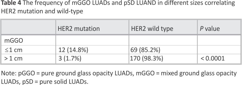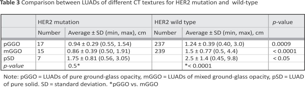 Overall, this study indicated that LUAD with HER2 mutation was smaller in size than LUAD with HER2 wild type for GGO-LUAD, mGGO-LUAD, or pSD-LUAD, respectively. Therefore, it can be inferred that LUAD with HER2 mutation had a slower growth speed than their counterpart. Furthermore, as LUAD with HER2 mutation transformed into mGGO, the size did not increase as observed in LUADs with HER2 wild type. This study will provide a reference for future research on this question.