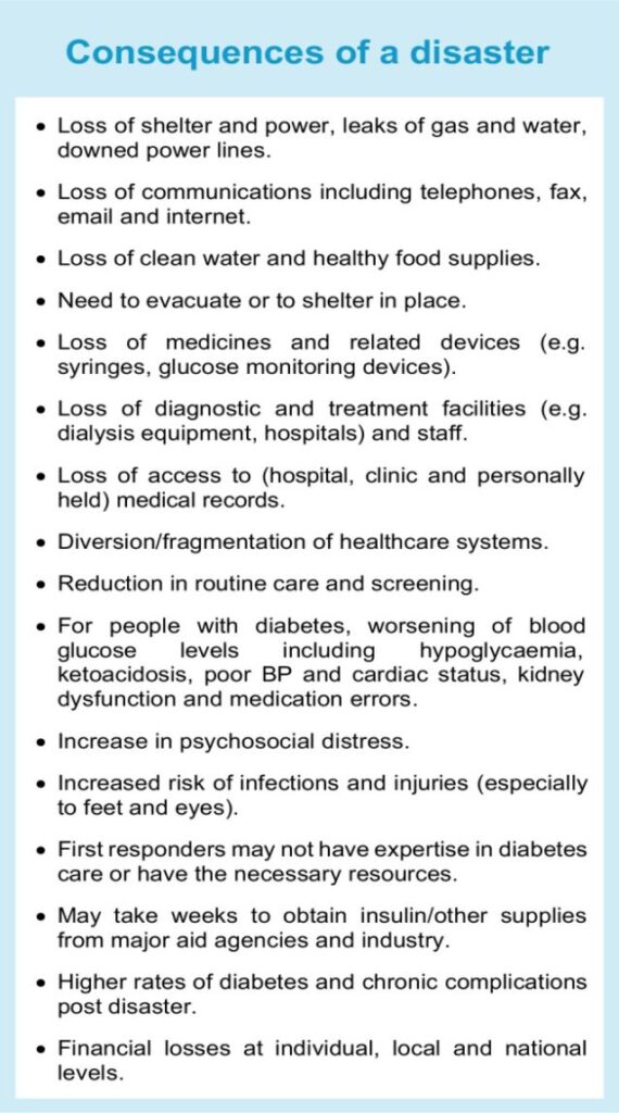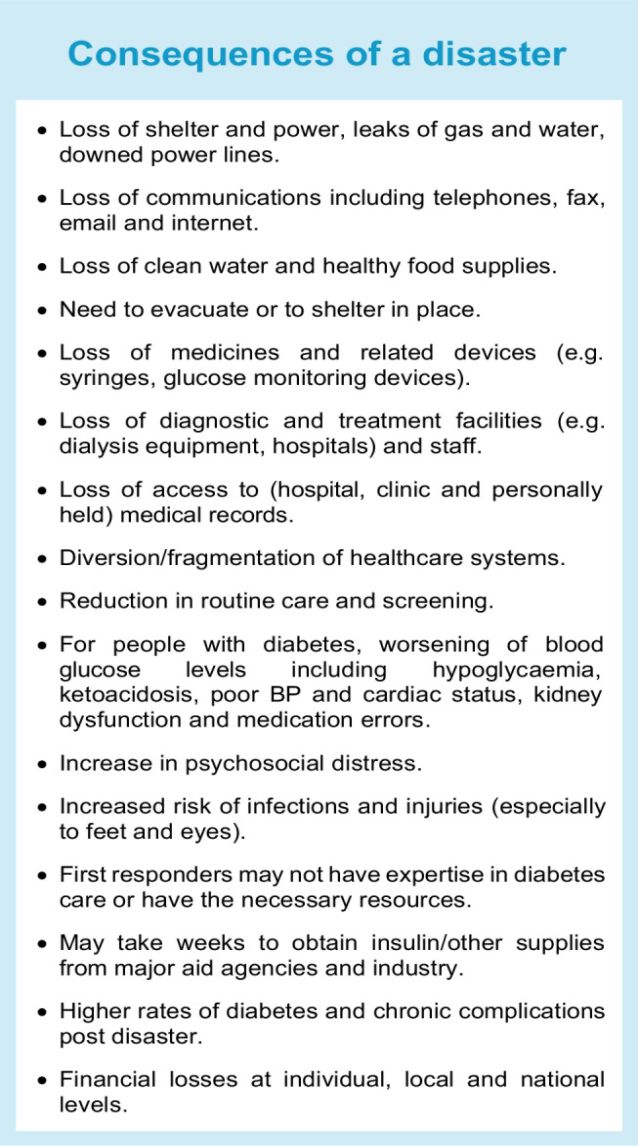 Medicines and related devices and medical records, diagnostic and treatment facilities (e.g. hospitals, dialysis units, clinics and eye screening programmes) and related staff may be lost or diverted during disasters, and available healthcare teams may not be knowledgeable in diabetes care, nor have access to adequate diabetes-related medicines and devices. Even if a disaster is unrelated to infection, infections may arise during a disaster or afterwards as a result of contaminated water or food supplies, people living in close proximity or injuries 5. Reserve medical supplies may not be adequate or accessible, supply and distribution chains may be disrupted, and emergency aid shipments may be denied clearance. During and after a disaster, metabolic control and risk factors (e.g. blood pressure) usually worsen, increasing the risk of new-onset prediabetes and type 2 diabetes and of chronic diabetes complications. Psychological stress can also be severe and prolonged. In addition, stress can affect healthcare and aid workers, so attention should also be given to their care. Disaster-related challenges are summarised in the Text box, ‘Consequences of a disaster’.