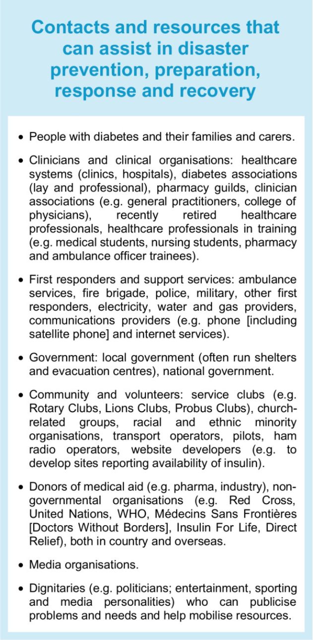 Injury, death and damage in disasters can be reduced through careful forward planning, preparation and responses. Many individuals and groups can assist in disaster prevention, preparation, response and recovery, ranging from individuals with diabetes and their families to clinicians and the health-care system, diabetes associations (professional and lay), local and national governments and local, national and international non-governmental organisations. Local input is essential, especially if aid is to come from overseas, for example local assistance with the receipt and distribution of aid. Local knowledge of geography, languages and needs, as well as relevant, ideally prearranged, contacts, is key to successful disaster management and should be outlined in disaster preparation plans. The Text box, ‘Contacts and resources that can assist in disaster prevention, preparation, response and recovery’, lists groups that medical system representatives may need to interact with during a disaster.