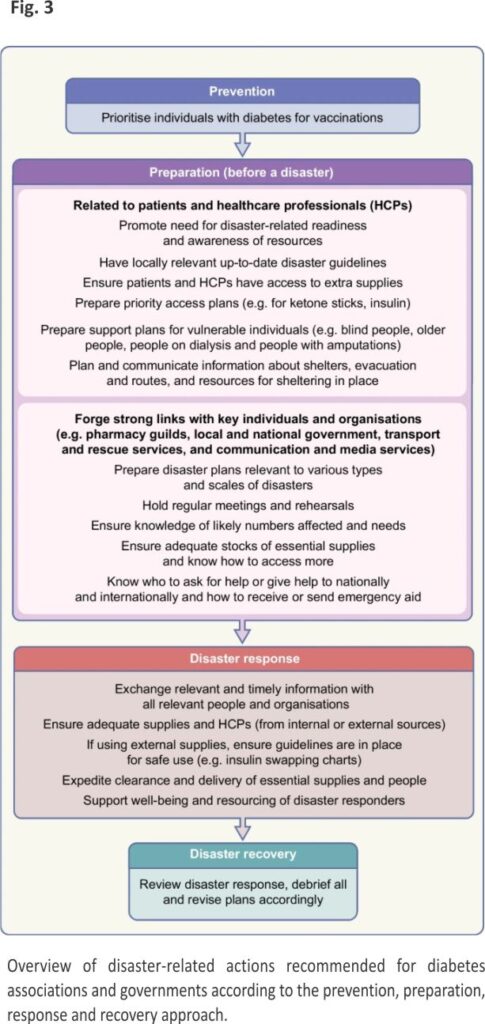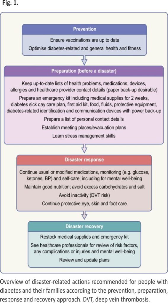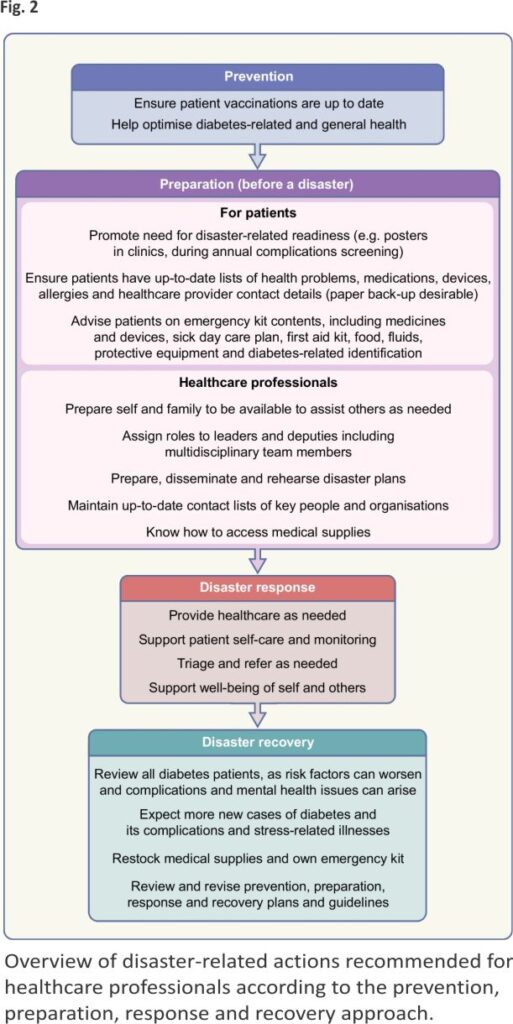 Credits: Boulton AJM, Jenkins AJ, Makkar B, Mankovsky B, Abera MA, Tesfaye S. Diabetes and natural and man-made disasters: prevention, preparation, response and recovery. Diabetologia. 2025 Nov;68(11):2465-2478. doi: 10.1007/s00125-025-06406-6. Epub 2025 Apr 15. PMID: 40234304; PMCID: PMC12534289.