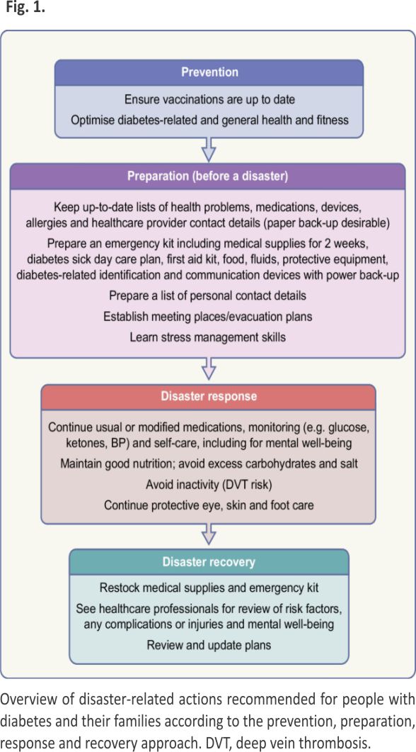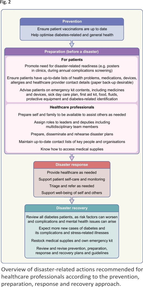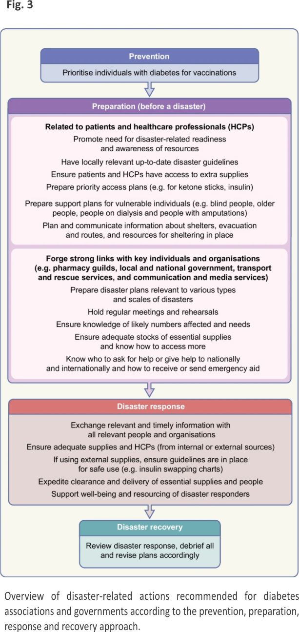 This review has focused on the management of diabetes and support for people living with diabetes in countries across the world affected by natural or man-made disasters. Examples of the problems faced and potential solutions from recent disasters are discussed and are summarised in Fig. 5. The IDF-WPR guidelines on diabetes care and disasters focus on the important principles of prevention, preparedness, response and recovery, which all those looking after people with diabetes should be aware of wherever they are located in the world. Sadly, both natural and man-made disasters appear to be increasing in incidence; thus, preparedness and united action is of vital importance to save people living with diabetes from avoidable morbidity and premature death due to lack of essential medications. Post-disaster assessments and sharing of experiences and resources are recommended.