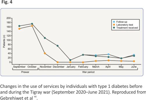 In Tigray as a whole, although underestimates owing to under diagnosis and limited access to diabetes care, there were 6726 people with type 1 diabetes and 17,627 with type 2 diabetes receiving regular follow-up at general and primary hospitals pre war in November 2020 52. About 80% of essential medications were available before the war, which plummeted to <20% by the start of 2022; similarly, the availability of routine laboratory tests, including blood glucose and HbA1c testing, dropped from 94% to <50% by the start of 2022 53. Insulin supplies declined sharply during the war and completely ran out by July 2021, resulting in avoidable deaths; doctors were forced to use expired drugs and individuals with diabetic ketoacidosis were treated with oral hydration because of a lack of i.v. fluids; and increased levels of malnutrition also complicated diabetes management, as individuals with diabetes had reduced resilience to fight communicable diseases 52. In addition, deaths of dialysis patients doubled because of interruptions to dialysis sessions 54, and healthcare professionals worked without pay for 17 months while facing severe food shortages 55. The IDF publicised this humanitarian crisis in January 2022 52, forcing the Ethiopian government to send limited supplies of insulin to Tigray 56,57. Although the war ended after the Cessation of Hostilities Agreement in 2022, healthcare services in Tigray have not yet recovered, and access to insulin and other critical medications still remains limited. Unfortunately, many healthcare professionals left their posts, seeking employment in other countries, further exacerbating chronic disease care 58. The war has had a major psychological impact on the public, including people with diabetes, with increasing levels of anxiety and depression 57,58. The Tigray war demonstrated that it takes only a few weeks for diabetes care to collapse and many years for it to recover. Almost all sections of society, including medical doctors, were seriously affected by the lack of insulin, with many deaths occurring, especially among children 57,59. The Tigray war highlights how strategies for rapid insulin access in areas hit by war and disasters need to be developed and ideally agreed at the United Nations and by all countries.