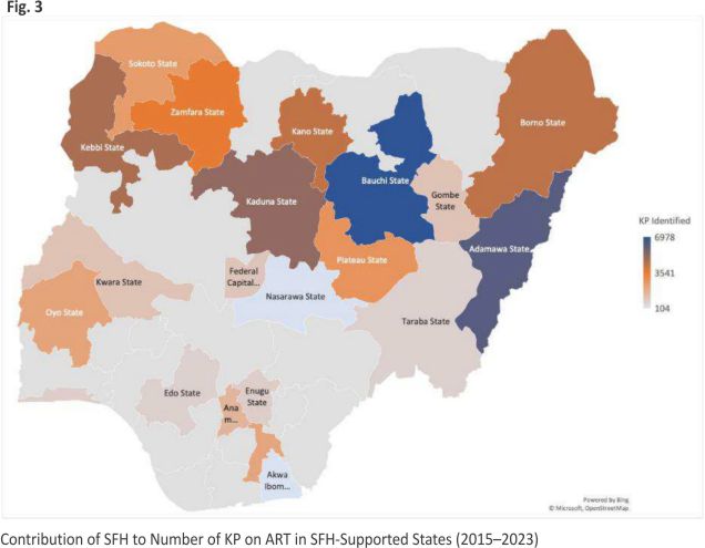 Overall, since it transitioned to a comprehensive HIV service partner, SFH has made significant contributions to Nigeria’s current efforts towards ending the HIV epidemic in 2030, to which reaching KPs with the HIV prevention and treatment services they need is central. SFH’s contribution to ART scale-up in each of its program states is shown in Fig. 3. On average, SFH contributed 95.5% to the KPs identified and placed on ART in each of its project states.
