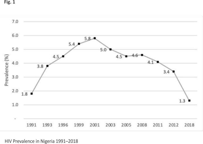 Initially, services for KPs as with the general population in Nigeria and other developing countries were largely preventive 24. With a prevention-only strategy, and a culture of denial, myths, and misconceptions, Nigeria’s HIV prevalence grew over the years. From the two HIV cases reported in 1986 25, Nigeria’s HIV prevalence grew from 1.8% in 1991 and reached a peak of 5.8% in 2001 21. However, perhaps by some work of providence, the year 2001 marked a watershed moment for the control of HIV in Nigeria. Following the United Nations General Assembly Special Session on HIV/AIDS in 2001, at which member countries adopted a declaration to control HIV/AIDS, Nigeria also pledged to launch an ARV program to stem the tide of HIV in the country. Treatment of PLHIV in Nigeria commenced in 2002 26 in 25 tertiary health facilities aimed at reaching 10,000 adults and 5000 children. The government’s initiative was soon complemented by the launch of the HIV control initiatives that also focused on treatment saturation by the United States PEPFAR program (2004 till date) 27 and the GFATM (2005 till date) 4. Following the launch of the HIV treatment program in Nigeria in 2001 and subsequent treatment programs, PEPFAR and GFATM showed demonstrable impact over the years. The prevalence of HIV, which peaked at 5.8% in 2001, gradually fell to 4.1% in 2010, and 3.4% in 2013 and reached its lowest of 1.4% in 2018 21 as illustrated in Fig. 1.