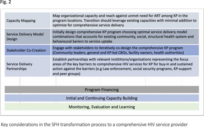 Setting up the OSS and KP-friendly facilities starts with consultations with key stakeholders in each state. These include representatives of the authorities responsible for oversight of efforts to control AIDS at the local government and state levels. These are called Local Action Committees on AIDS (LACAs) and State Agencies for the Control of AIDS (SACAs) respectively. In addition, consultations also involved representatives of civil society organizations active in HIV control efforts, specifically, the KP-led organizations and organizations that are championing the care needs of KPs. Consultations with the Ministries of Health in the States, representatives of LACAs, SACAs, and religious and traditional leaders, ensure buy-in of these important gatekeepers of the initiatives and facilitate consensus on suitable locations to site the facilities for the OSSs and the selection of ART health facilities for the KP-friendly transformation approach. It is also an important step to ensure alignment of the OSS and the KP-friendly facilities into the overall AIDS control plan of the state as this promotes sustainability and enhanced engagement with policy issues needed to address stigma, discrimination, and neglect of the needs of KPs. Consultations with civil society organizations active in HIV control efforts, especially those that are KP-led also enabled buy-in as well as agreement on the role of the KP representatives in the operations of the OSS and the KP-friendly facilities, and identification of suitable KP candidates to take on available positions and training, especially in the OSSs. Figure 2 high-lights some of the key considera- tions in SFH’s transformation from a prevention-only, to a comprehensive HIV service provider.